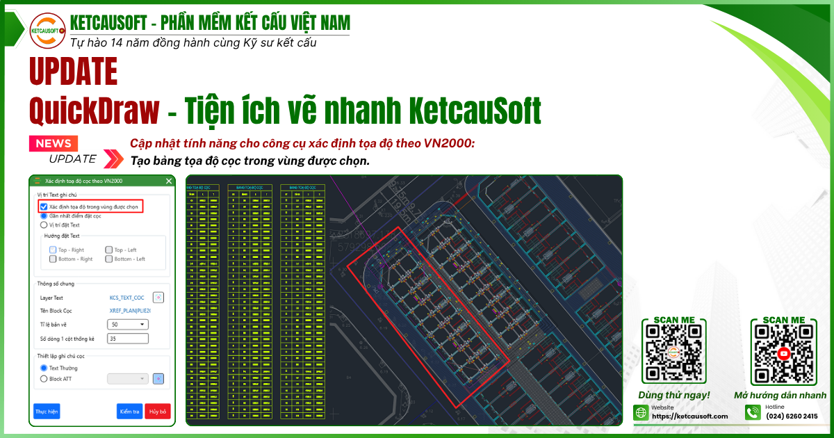 "KetcauSoft là phần mềm hỗ trợ tốt cho kỹ sư trong việc thiết kế cũng như triển khai bản vẽ thi công một cách nhanh nhất, hiệu quả và chính xác nhất từ khâu tính toán, triển khai bản vẽ cũng như quản lý kiểm soát hồ sơ đem đến tối ưu cho người kỹ sư kết cấu."