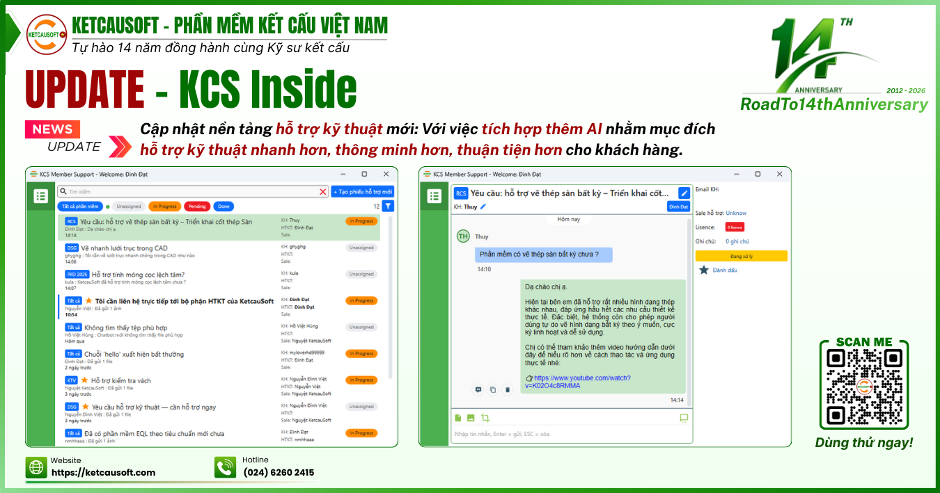 Với mục đích tăng tính trực quan cho người dùng, cũng như giúp các bạn kỹ sư mới có cách tiếp cận khoa học hơn với cách thực hiện cũng như quản lý hồ sơ kết cấu. KetcauSoft thực hiện loạt clip hướng dẫn thực hiện hồ sơ kết cấu áp dụng bộ phần mềm KetcauSoft. Với file hồ sơ mẫu, bạn sẽ có sẵn một framework để dễ dàng tạo được hồ sơ kết cấu mới. Khám phá thông qua loạt clip dưới đây bạn nhé.
