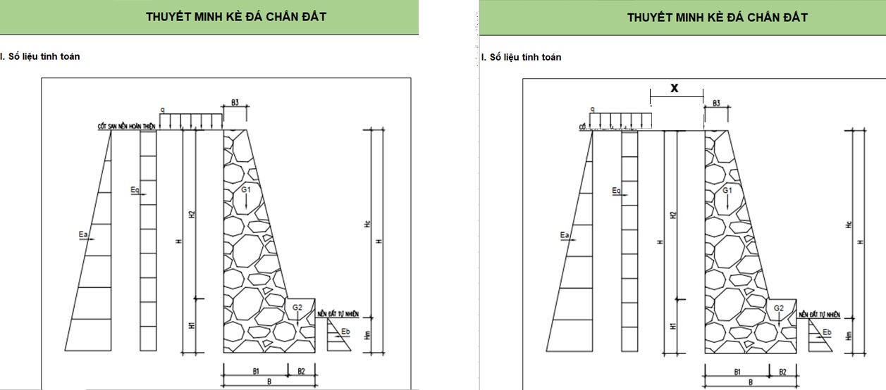 Bài toán của em có công trình nằm trên lớp đất phía sau kè (công trình hiện trạng), tuy nhiên công trình nằm cách kè 1 đoạn x (tầm 2m - như hình bên phải). Vậy trường hợp này có công thức nào liên quan giữa khoảng cách "x" và áp lực ngang lên thân kè không ạ?
