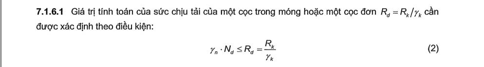 Dạ. Em chào anh Hùng và các anh chị trong ketcausoft. Anh Hùng cho em hỏi là trong công thức tính sức chịu tải của 1 cọc Rd = Rk/yk thì hệ số yn là hệ số tầm quan trọng của công trình có đưa xuống dưới không ạ. Nếu không đưa xuống dưới thì sức chịu tải của 1 cọc theo TCVN 10304-2025 lớn hơn nhiều so với TCVN 10304-2014 phải không ạ. Em cám ơn anh nhiều.
